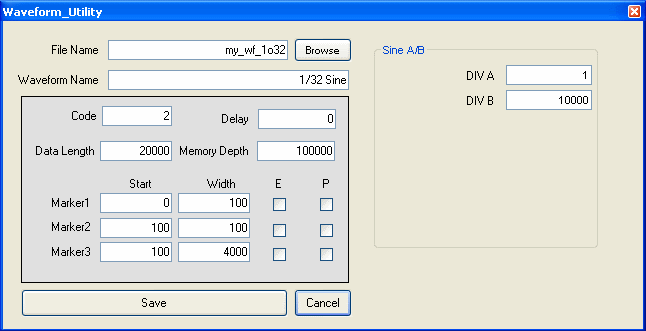 » First, load any predefined waveform from the drop-down list in the Waveform panel, and simply change any parameters to the desired settings. Then either click on the "Save Waveform As" button or go the menu bar and click on File --> Save as.