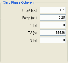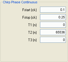 If these chirp parameters were used with a 4 GHz clock input, then the start frequency woud be 400 MHz (0.1*4000MHz), and the stop frequency would be 1GHz (0.25*4000MHz). As for their time interval parameters, you can see that the default values have no delay before and after the chirp. However, the chirp duration is set as 65536 data points. This will correspond to about 16.4 microseconds ((1/4e9)*65536).