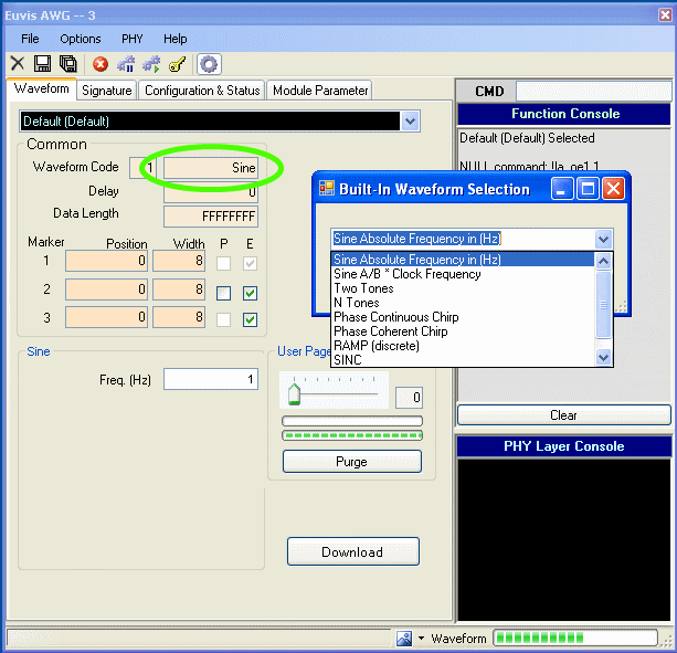 The waveform code text box is located at the top of the Common parameters section in the Waveform panel. Before entering in a code, you should first choose any waveform from the drop-down list. This step initializes some parameters for the GUI. You do not need to download that waveform.