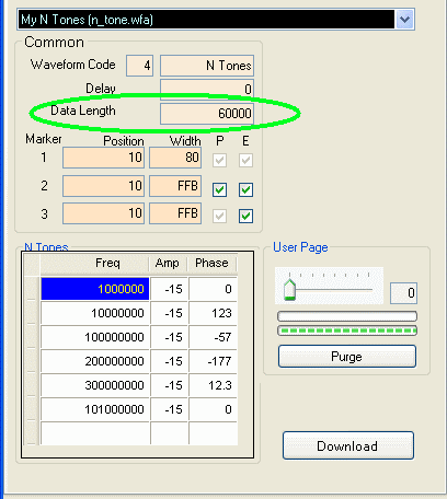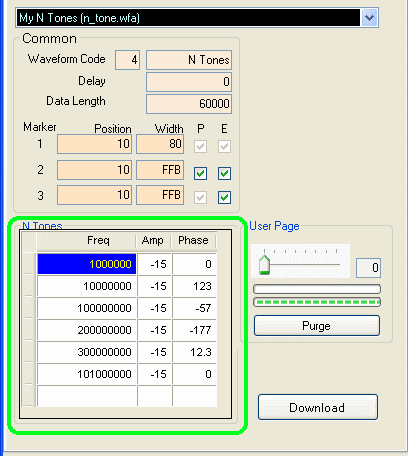 Below is an example of the parameters for a six-tone waveform. There are six sine waves added together: