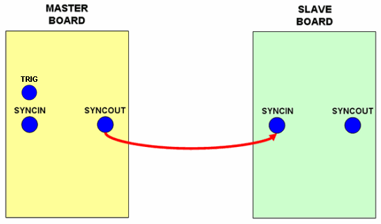your trigger source to connect to the SYNCIN connectors on both slave board. Since