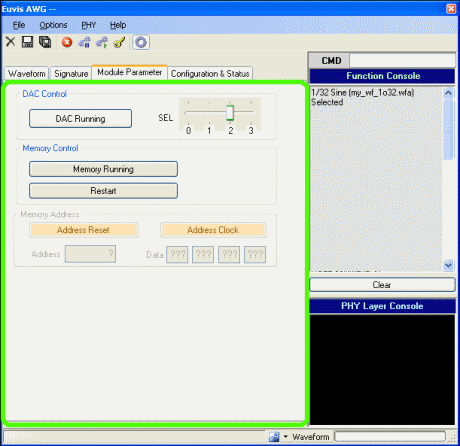 The module parameter panel is accessed by the third tab below the tool bar and menu bar, near the top of the application window. From this panel you can set the MUXDAC sampling select window, set whether to stop or start the DAC and memory, and see the actual memory data.