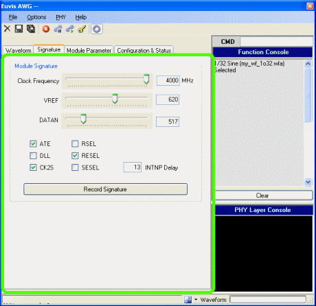 When you have adjusted the settings optimally for your current clock frequency, click on the Record Signature button to save these settings. These settings will overwrite any previously saved settings for your selected frequency. The signature file must be in your working directory so that, in the future, these settings will be recalled whenever you slide the clock frequency bar to this frequency (or to a higher frequency, up to the next recorded signature).
