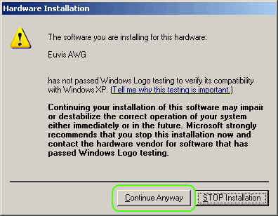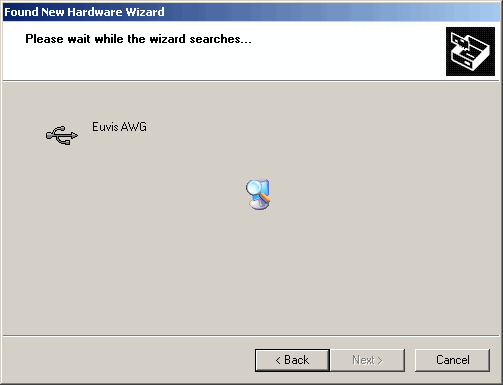 » Select Search for the best driver in these locations option and make sure that Include this location in the search is checked. You will need to make sure that the location is pointed to the correct driver in your AWG installation folder. By default this is "C:\Euvis\AWG\Driver\XP" for Windows XP. If the location is not set to the correct folder you will need to click on Browse and point it to the correct location.