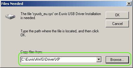 » After a few seconds, the installer will ask you for the location of the driver. In the "Copy files from" box make sure that it points to the correct driver in your AWG installation folder. By default this is "C:\Euvis\AWG\Driver\XP" for Windows XP. If the location is not set to the correct folder you will need to click on Browse and point it to the correct location.