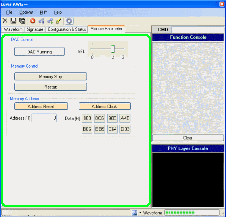 The module parameter panel is accessed by the fourth tab below the tool bar and menu bar, near the top of the application window. From this panel you can set the MUXDAC sampling select window, set whether to stop or start the DAC and memory, and see the actual memory data.