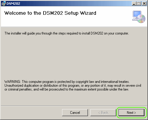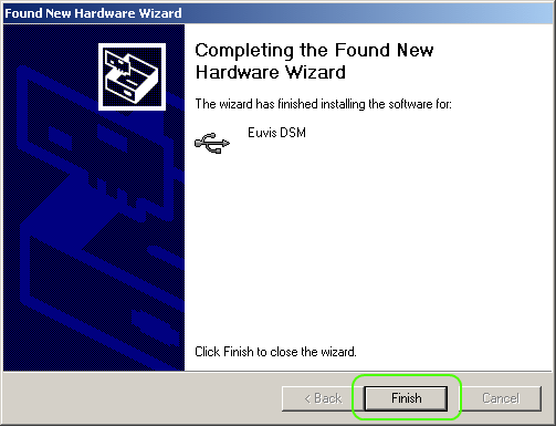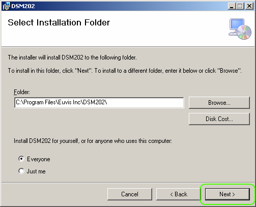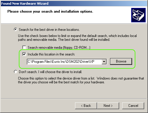 "C:\Program Files\Euvis Inc\DSM202\Driver\XP" for Windows XP. If the location is not set to the correct folder