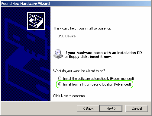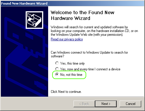 "Found New Hardware Wizard" window. From the options listed in the window, select