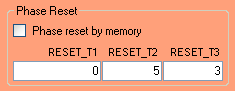 The click box enables or disables phase reset by memory. When this box is not checked, the phase reset is controlled using the parser and the GUI DDS Reset button in the Module Parameter window. You can also specify RESET_T1, RESET_T2, and RESET_T3. The three time parameters specify the number of data points to set. They should be entered as hexadecimal. For more details on phase reset and the three reset time parameters, please see the Phase Reset subsection on the Parameters page in the Operation Details section.