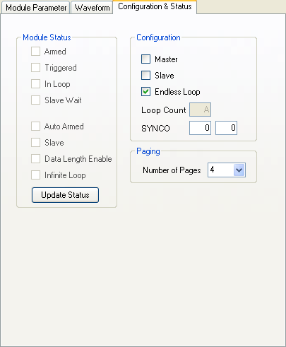 Slave Wait - displays if board is in the the "Slave Wait" state which is equivalent to the "Armed" state of the Master or Standalone modes. In the "Armed" state of the Master or Standalone, the board waits for the TRIG signal to begin waveform output while in the "Slave Wait" state of the Slave, the board waits for the SYNCI signal to begin waveform output.