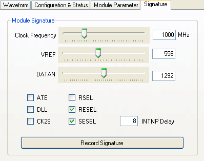 The signature page allows you to adjust the threshold voltages of the two signals that contribute to the DSM's chirping stability. Normally, we will provide you with a signature file which will have preconfigured settings for all the range of frequencies from 500 MHz up to about 2.5 GHz. Although we try our best to get the right settings, sometimes you will have to fine tune these settings. The benchmark waveform is called "Benchmark Reset" and can be found in the waveforms drop-down list in the Waveform Window. To benchmark frequencies, first set the input clock to 500 MHz and observe what the waveform looks like. Then change the input clock to the desired frequency. The waveform at any frequency should look like the waveform observed at 500 MHz. If it does not look like the same waveform, then you should try adjusting VREF and DATAN until the waveform looks similar to the benchmark waveform.