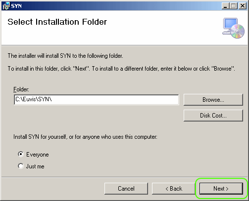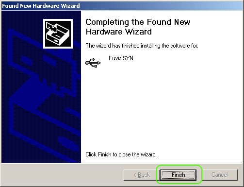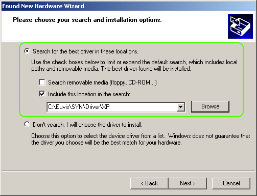 "C:\Euvis\SYN\Driver\XP" for Windows XP. If the location is not set to the correct folder you will need to