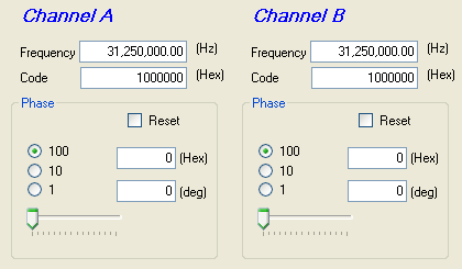 The two channel control group boxes contain the frequency and phase parameter inputs. The frequency inputs are comprised of 2 text box inputs to control the frequency. The phase inputs are comprised of 3 radio buttons, a horizontal scroll bar, 2 text box inputs, and 1 checkbox.