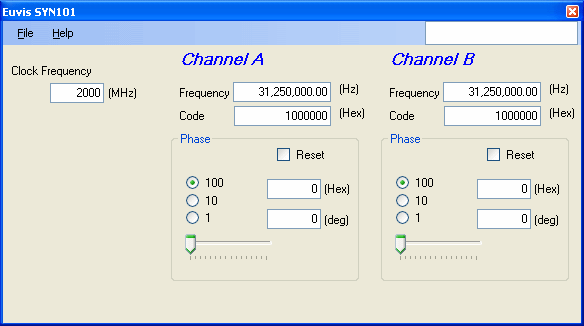 The main window is comprised of two drop down menus, a clock frequency text box, and two channel control group boxes.