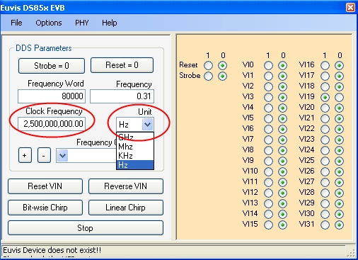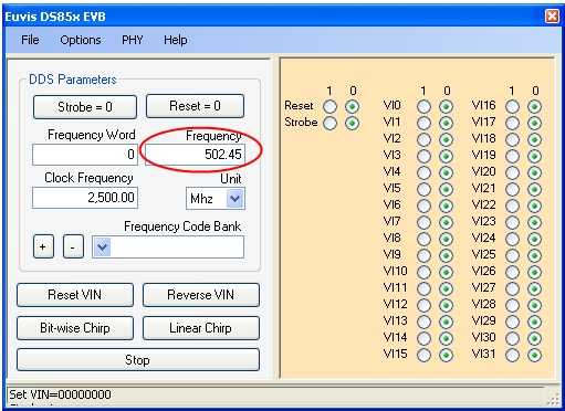 NOTE: The maximum output frequency is half of the clock frequency. So if the clock is 2.5 GHz, then the maximum output frequency is 1.25 GHz. If you enter a frequency that is more than half the input clock frequency, the real output frequency will be: Input Clock Frequency - User Defined Frequency. For example if the input clock was 2.5 GHz (max output frequency 1.25 GHz) and the user enters 1.95 Ghz in the Frequency box then the output frequency will be 2.5 - 1.95 = 0.55 GHz or 550 MHz.