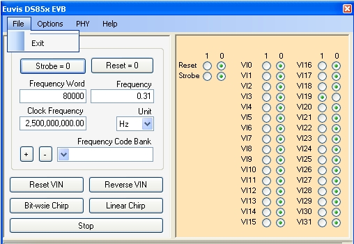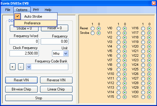 Auto Strobe - same as the Auto Strobe described above. When this is enabled, the program automatically updates output after user changes frequency. When this option is not enabled, user will have to manually strobe in frequency changes using the "Strobe" button.