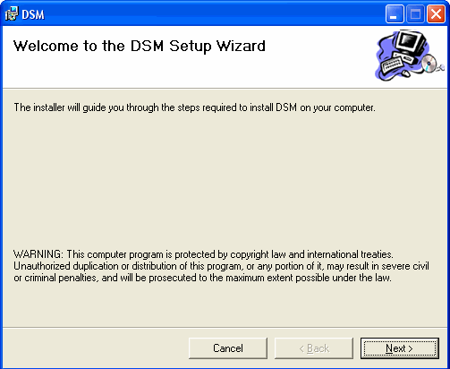 » Following the .NET installation, the DSM Setup Wizard will appear. Please click on Next.