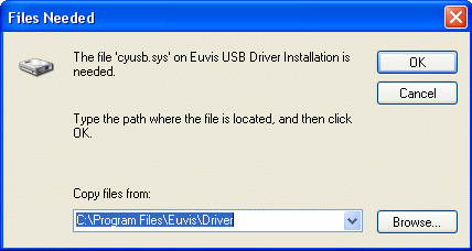"Copy files from" box enter C:\Program Files\Euvis\Driver.