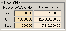 Specifies maximum frequency. Defined in hexadecimal frequency word and decimal real frequency. You may change either the frequency word or the real frequency. In the memory dump file, this attribute is referred to as "Chirp2". Please note that the real maximum frequency may not be the Stop frequency attribute that you define. For more information, please go to the Data Length page in the Operation Details section.