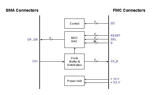 signals, and DC power via FMC connectors. The
