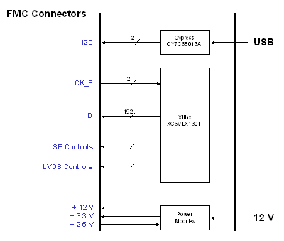 digital data, DAC controls, I2C signals, and DC power via FMC connectors. The