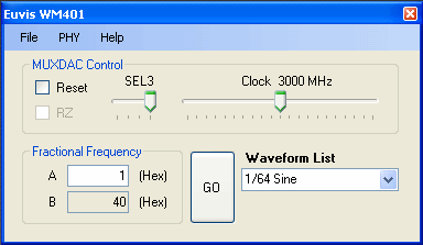 The main window is comprised of 3 dropdown menus, a Fractional Frequency groupbox, a MUXDAC control groupbox, a waveform list combo box, and a GO button.
